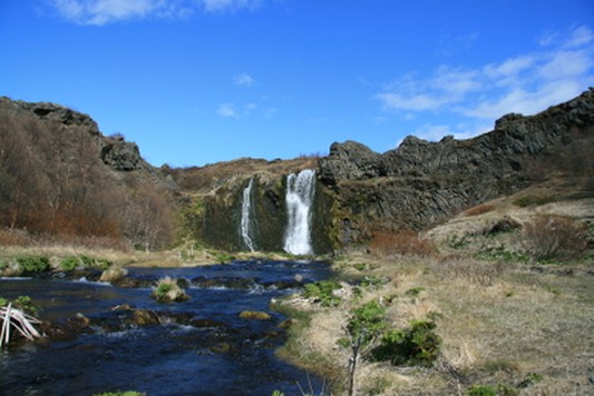 Je nach Höhenlage liegt hier natürlich noch Schnee. Wir wollten vor ein paar Tagen eigentlich zum Haifoss, aber die Straße war noch gesperrt. Auf dem Weg dahin kamen wir aber auch ein paar hundert Meter über den Meeresspiegel und haben mal ein paar Schhneebälle geworfen.Und ebenfalls auf dem Weg dahin haben wir uns den Hjálparfoss angesehen. Der ist neben seiner "Doppelläufigkeit" vor allem deshalb interessant, weil er von so bizarren Basaltformationen umgeben ist.