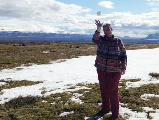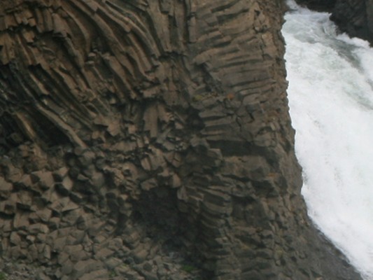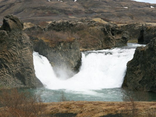 Je nach Höhenlage liegt hier natürlich noch Schnee. Wir wollten vor ein paar Tagen eigentlich zum Haifoss, aber die Straße war noch gesperrt. Auf dem Weg dahin kamen wir aber auch ein paar hundert Meter über den Meeresspiegel und haben mal ein paar Schhneebälle geworfen.Und ebenfalls auf dem Weg dahin haben wir uns den Hjálparfoss angesehen. Der ist neben seiner "Doppelläufigkeit" vor allem deshalb interessant, weil er von so bizarren Basaltformationen umgeben ist.