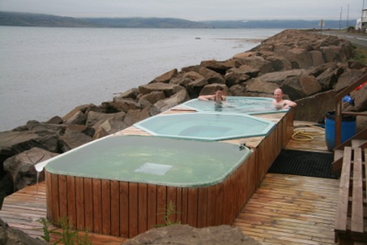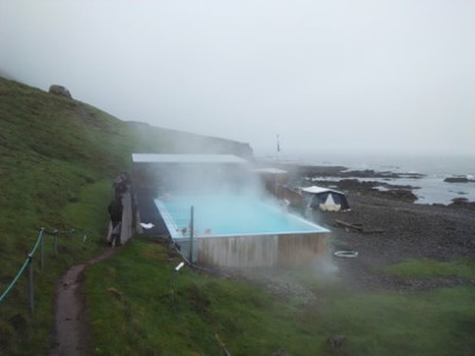 Die Hotpots mit der schönsten Aussicht liegen wohl sicher in den Westfjorden. Hier wollten wir, nachdem wir ja soviel Kultur in Hvammstangi hatten, uns in die heißen Fluten stürzen und hemmungslos entspannen. Gesagt getan, nach nur einer relativ kurzen Fahrt von Hvammstangi nach Drangsnes fanden wir gleich an der Hauptsraße, wenn man es so nennen mag, den örtlichen öffentlichen Hotpot. Die Einwohner von Drangsnes sind so freundlich, den vorbeikommenden Menschen einen Hotpot direkt am Wasser zur Verfügung zu stellen.Um genau zu sein sind es eigentlich drei kleine, die unterschiedliche Temperaturen haben. Bevor man die Pools entern kann muss man, wie in Island üblich unter die Dusche. Auf der anderen Straßenseite stehen dafür zwei Kabinen zur Verfügung. Also geduscht und rein -