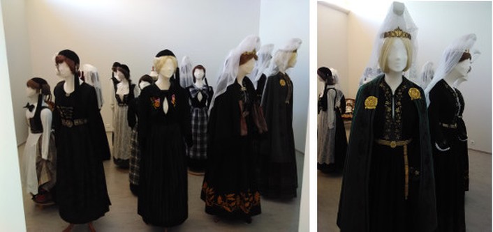 Das Museum stellt auch alte isländische Frauentrachten aus. Interessant finde ich an der Tracht auf dem rechten Bild, wie Elemente alter Wikingertrachten optisch ungefähr erhalten blieben, ihr Funktion aber verloren. Die Schildkrötfibeln, die beim Frauenkleid der Wikingerinnen die Träger mit dem Rockteil verbanden, hatten damit neben dem schmückenden Aspekt auch eine technische Funktion. Bei der Tracht im Museum sind sie an gleicher Stellen, aber nur noch schmückend und außerdem rund statt oval. Ähnliches gilt für die Kette von Metallelementen, die vom Metallelement-